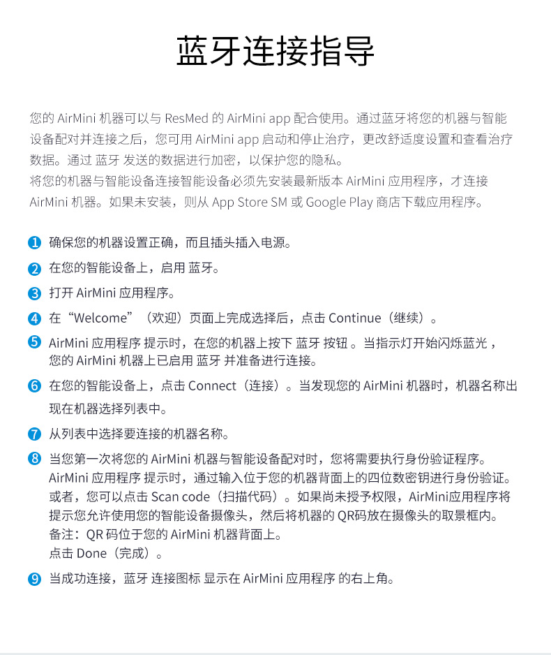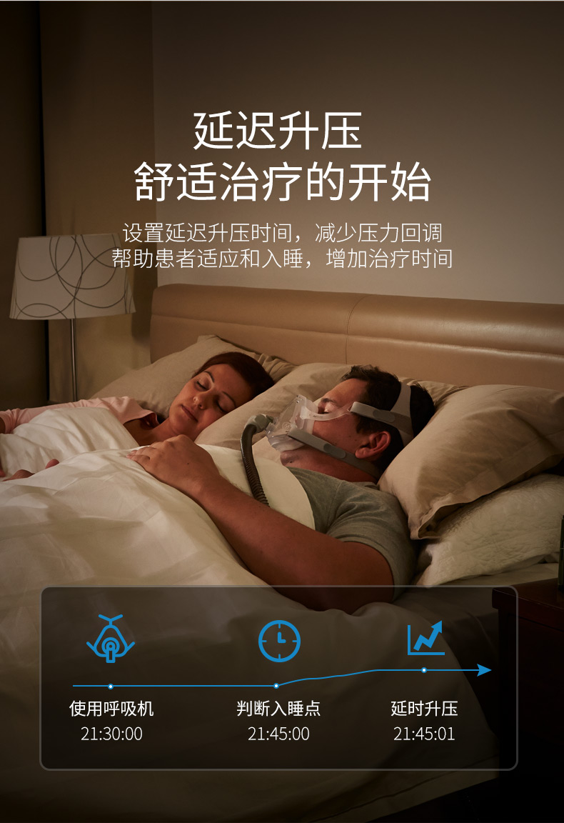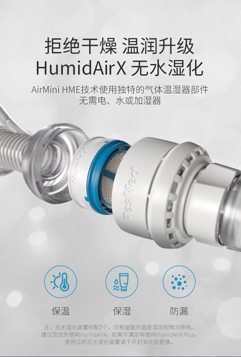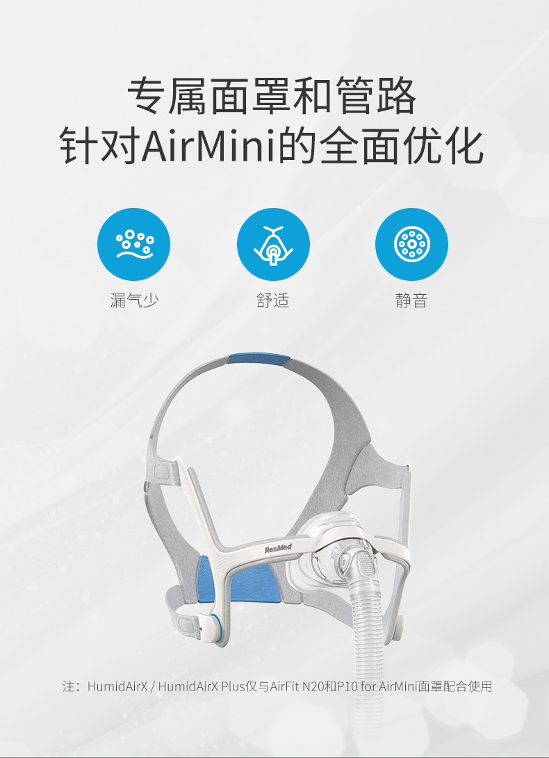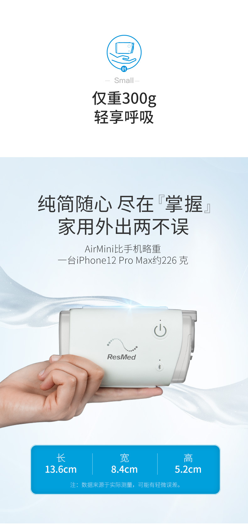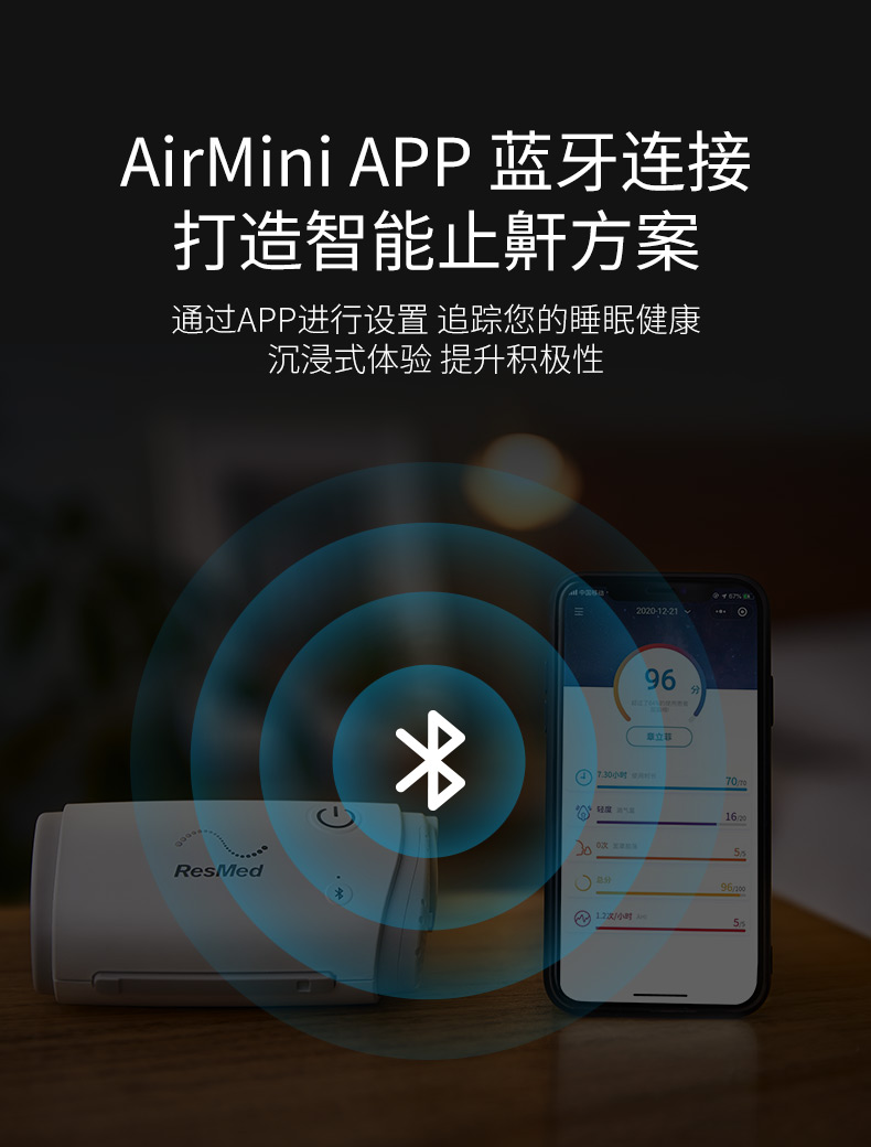 AirMini正壓通氣治療機 l 便攜小巧自由隨行 融匯小巧與輕盈,時尚簡約 便攜自由 隨時隨地輕松治療 l 智享藍牙智慧舒適 藍牙連接,APP調(diào)節(jié)參數(shù) 數(shù)據(jù)信息,盡在掌握 無水加濕,舒適睡眠新體驗 l 科技呵護專業(yè)可靠 三扇葉馬達 Active Airt恒量排氣技術 算法可靠,個性化治療新選擇